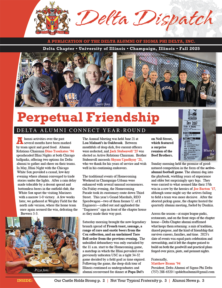 Welcome to the Sigma Phi Delta Alumni Website! Make sure to check out our newsletter archives, alumni corner, and update your information. Events Update Information Newsletters News & Events Read the latestDelta Dispatch Newsletter Newsletter Archive No events scheduled at this time. Connect With Us Help us find lost brothers. Submit an email Update your information. Photos View Photos